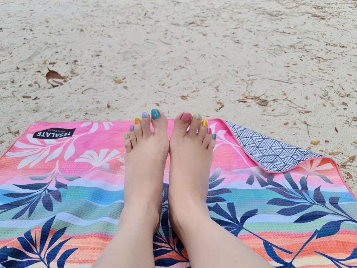 Guess what’s behind me? It is the famous Tesalate sand-free beach towel! We love going to the beach but I always hate that there will be a lot of cleaning to do. Especially the towels and mats are like magnets to the sand! It is so hard to get rid of the sand. I had to hand wash and rinse the beach towel multiple times to remove all the sand. I was amazed to hear that there is a beach towel that can be sand-free! Wow! how did they make it possible?! It even comes with Lifetime Guarantee!