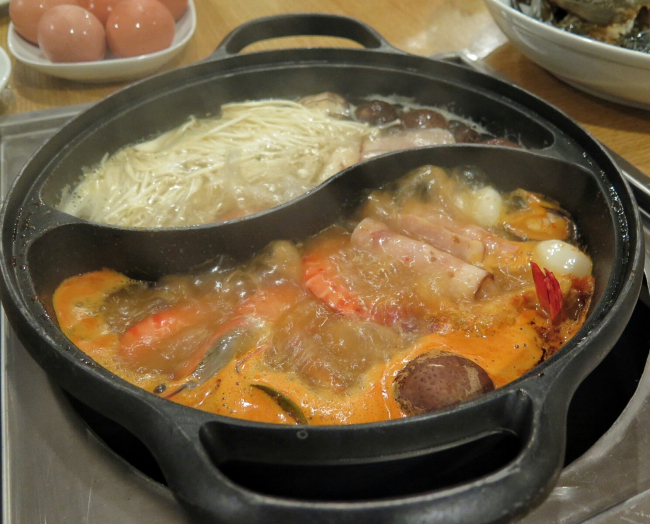| Quick Review: | It was long queue when we reached. It is a very popular choice. I guess it is nice and heartwarming to have steamboat dinner with family in the cold weather at the Resorts at a spacious and relaxing ambience. Wow the steamboat dinner is just about ~63 RM (S$21) per pax. We had 11 persons but we ordered the set meal for 8. Guess what we can’t even finished the dinner. The portions are very generous. The seafood were very fresh and they also offer a good variety in the set meal. We had crabs, prawns, mushrooms, dumplings, vegetables, eggs, noodles, ham with aromatic spicy tom yam soup and chicken soup with refreshing Freezy Calamansi Juice. There are about 20 different sauces freshly prepared daily. You can order other ala carte as well like the Australian snow crab, Canadian geoduck and Boston Lobster from the aquarium. |